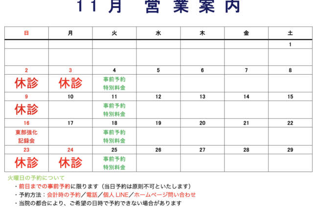 11月の営業時間のお知らせです。・3日・24日:祝日のため休診となります。事前予約日・時間外料金についてR7.10.12更新