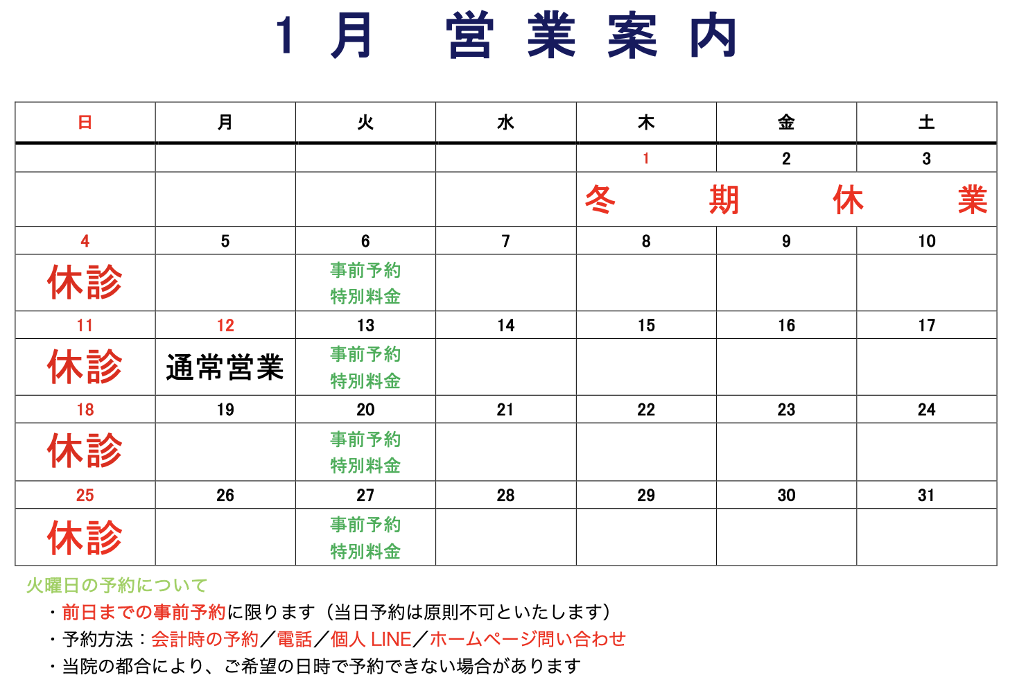 営業案内 2025.11.30 1月の営業について 1月の営業時間のお知らせです。・30日〜1月4日まで、冬季休業といたします。・12日は祝術ですが通常営業いたします。 事前予約日・時間外料金について R7.12.1更新 記事のタイトルとURLをコピーする Post 12月の営業について 前の記事