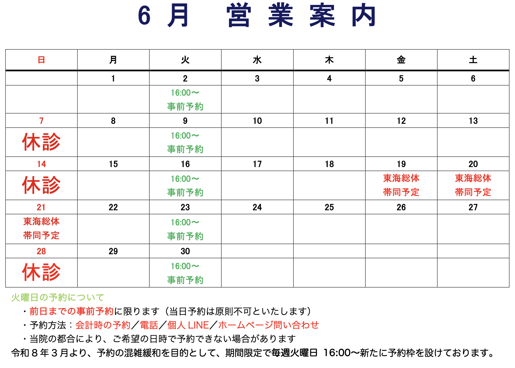 令和8年3月より、予約の混雑緩和を目的として、期間限定で毎週火曜日 16:00~新たに予約枠を設けております。